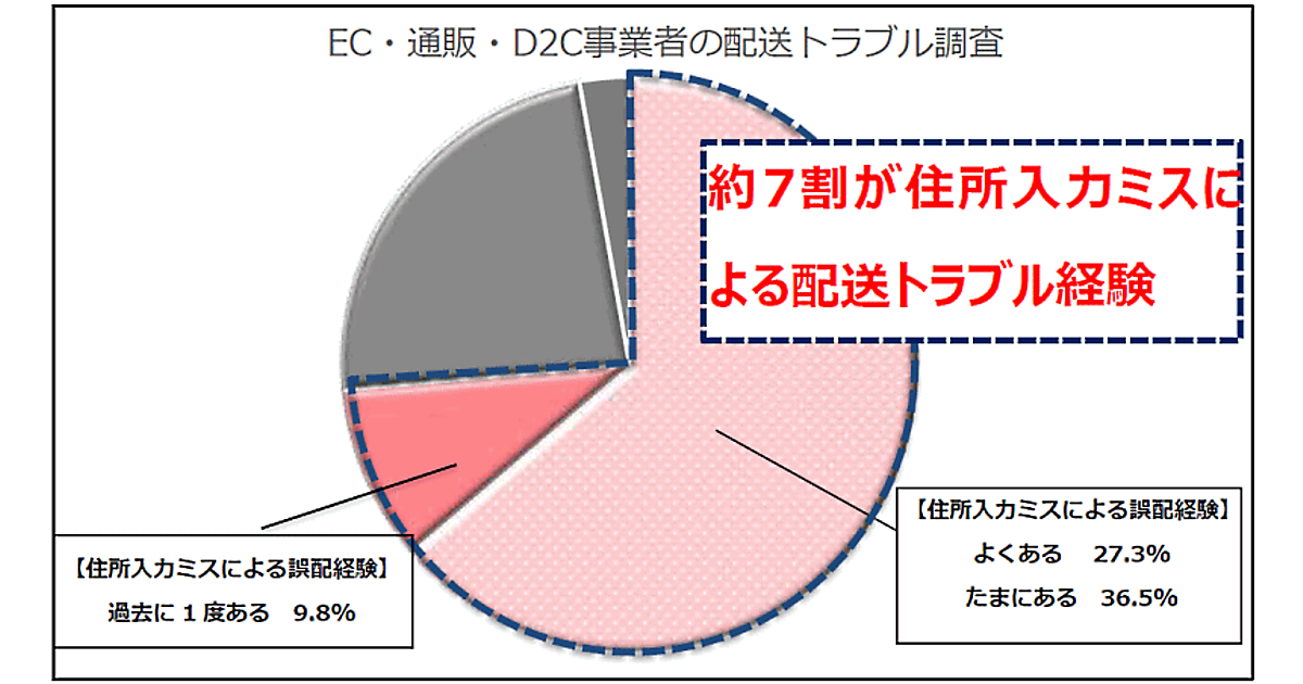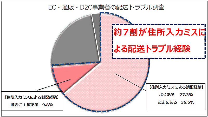 地図情報配信サービスのインクリメントPが、EC・通販・D2C事業の従事者を対象に実施した住所の入力ミスによる誤配や遅配などの配送トラブルに関する調査によると、73.6%の事業者が住所の入力ミスを原因とする誤配・遅配の経験があり、63.8%の事業者で定期的に発生している。