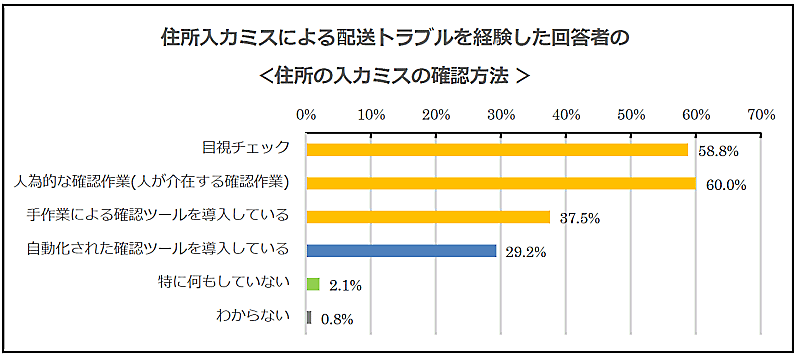 住所入力ミスの確認方法トップ3は「人為的な確認作業」(60.0%)「目視チェック」(58.8%)「手作業による確認ツールの活用」(37.5%)と、手作業の確認が大半を占めている。
