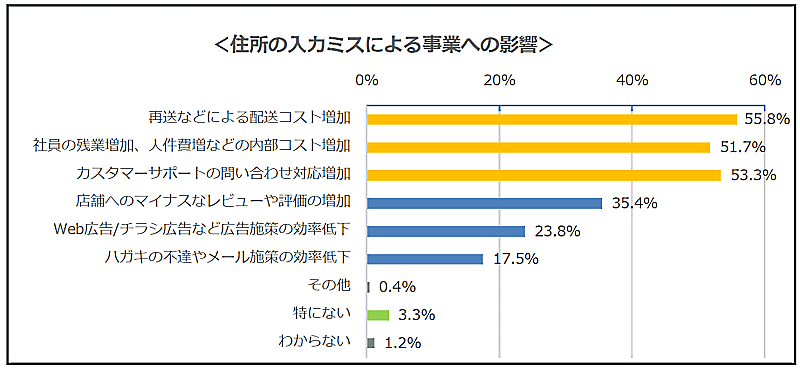 住所入力ミスによる最も大きかった影響は「再送などによる配送コスト増加」で55.8%。「残業増加など、人件費の内部コスト増」の51.7%、「カスタマーサポートへの問い合わせ対応増」が53.3%と続いている。
