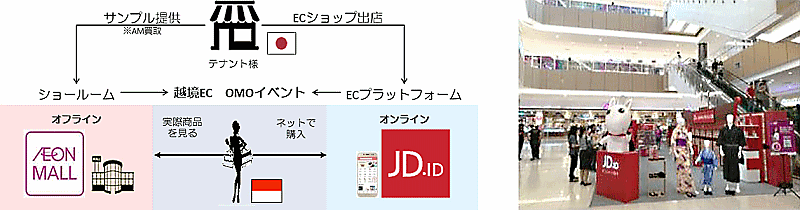 越境ECビジネスにも取り組む。インドネシアに未進出の日系企業の商品ショールームをモール内に設置。販売はWebで行い、決済後、商品の輸入、消費者への宅配を行う。インドネシアに進出する前のテストマーケティングも可能となり、インドネシア進出を検討している専門店企業への支援、将来イオンモールへの出店につなげる取り組みとなる。