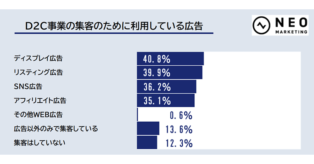 D2C事業の集客のために利用している広告について聞いたところ、「ディスプレイ広告」が40.8%、「リスティング広告」が39.9%。「SNS広告」は36.2%、「アフィリエイト広告」は35.1%で、Web広告の主要4種類は、どれもほぼ均等に利用されている。