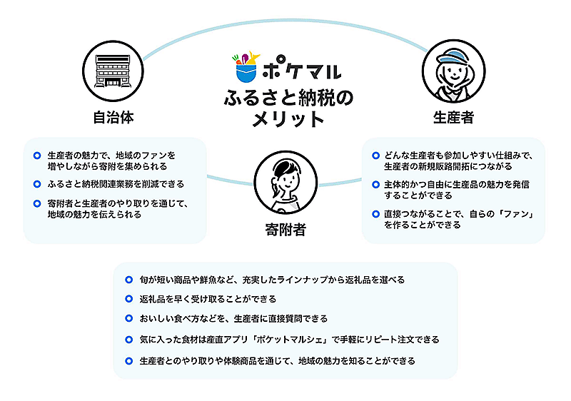 寄附者は返礼品を早く受け取れる、疑問点を直接生産者に質問できるなどのメリットがある。また、気に入った商品は「ポケットマルシェ」でリピート注文も可能。また、生産者とのやり取りや返礼品を通じて生産者や地域の魅力を知ることができ、第2のふるさとを持つきっかけにもなる。