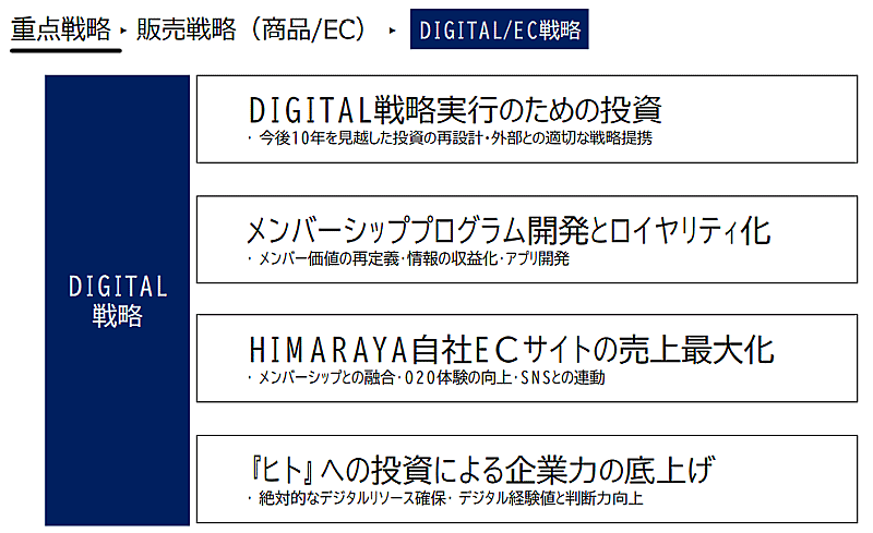 自社サイトの独自性と利便性向上による売上拡大、ヒマラヤメンバーズのプログラム開発とロイヤリティの向上、デジタルマーケティングの再構築とMD戦略との連携強化、EC倉庫運営強化によるEC倉庫出荷比率の拡大などに取り組む。