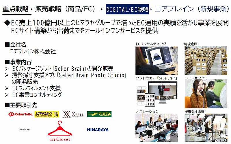 新規事業として展開している、自社のEC運用ノウハウを生かしたEC支援事業も強化する。コアブレインはECサイトの構築から出荷までをオールインワンサービスとして提供。ECパッケージソフト「Seller Brain」の開発販売や、撮影採寸支援アプリ「Seller Brain Photo Studio」の開発販売、ECフルフィルメント支援、ECコンサルティングなどを手がけている。