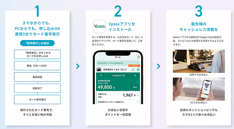 スマホから申し込み後、最短5分で番号が発行される。たとえば、カード発行後すぐにECサイトを利用したり、Apple Payなどの決済サービスに登録すれば店舗での買い物にもすぐに使うことができる。