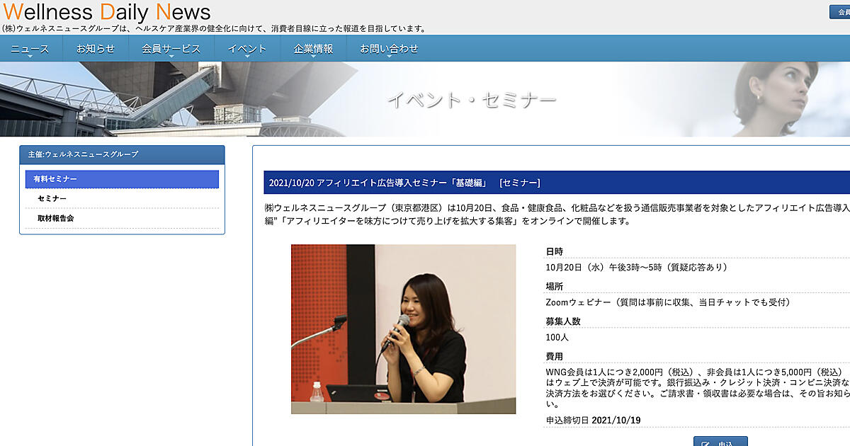 アフィリエイト広告導入セミナー基礎編「アフィリエイターを味方につけて売り上げを拡大する集客」をオンラインで開催。対象は食品、健康食品、化粧品などを扱う通信販売事業者(主催:ウェルネスニュースグループ)