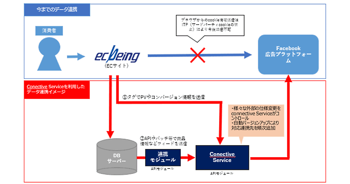 コンバージョンAPIの標準オプション化にあわせ、次世代マイクロサービス「ConnectiveService」を開発。さまざまな外部の仕様変更を「ConnectiveService」がコントロールする。自動バージョンアップで対応連携先を順次追加する。コンバージョンAPIは「ConnectiveService」連携先の第一弾。