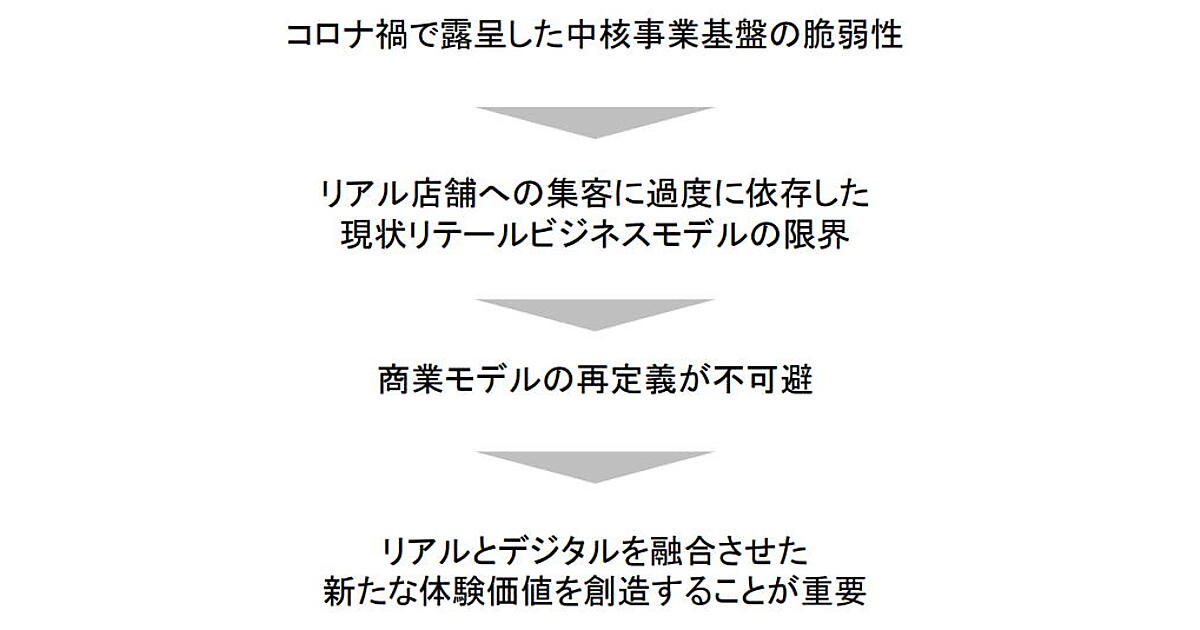 J.フロントリテイリングは百貨店事業について、コロナ禍で露呈したリアル店舗への集客に依存したビジネスモデルの脱却をめざし、リアルとデジタルを融合させたOMOによる新たな体験価値創造に取り組んでいる。