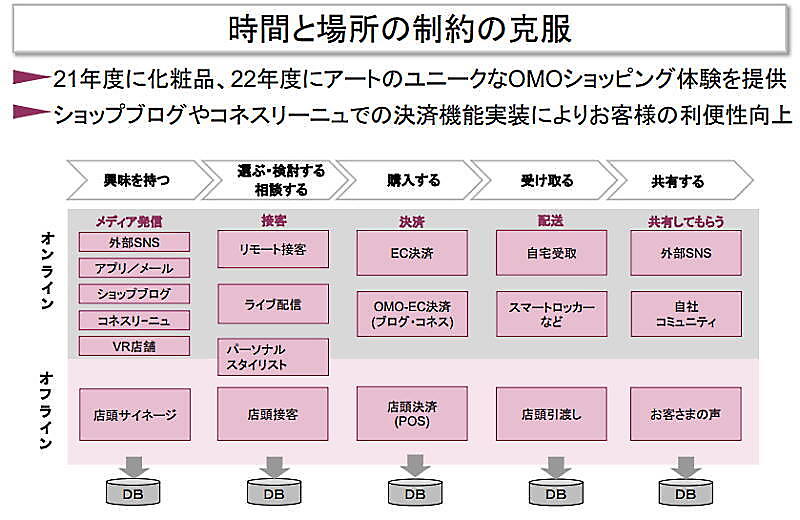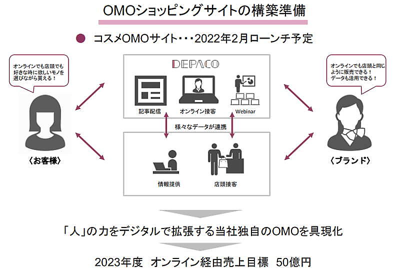 OMOショッピングサイトの構築準備にも取り組む。コスメOMOサイトを2022年2月までにローンチする予定。オンラインおよび店頭でも購入、販売ができるようにする。「人」の力をデジタルで拡張する独自のOMOを具現化する。OMOショッピングサイトで2023年度、オンライン経由売上目標50億円をめざす。