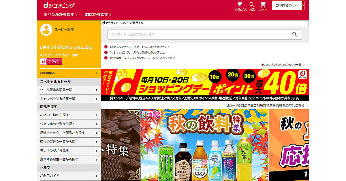 大きなところではメインの販促キャンペーンである「dショッピングデー」の内容も改めた。従来まで毎月20日、すべての商品を対象に、合計4400円以上、購入した顧客へポイント進呈率を、2000ポイントを上限に一律通常進呈率(※110円につき1ポイント)の20倍にしていたが、9月からは毎月10日と20日の2回、実施し、ポイント進呈率も一律でなく、商品ごとに10・20・30・40倍とした。上限も5000ポイントに増やした。