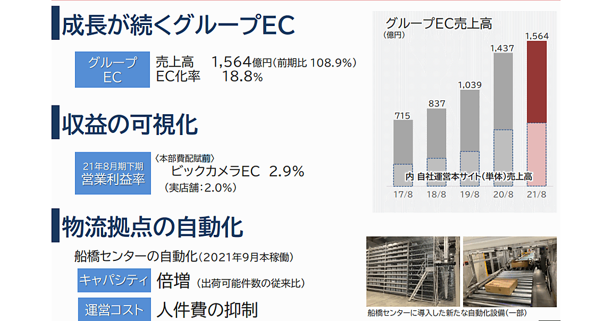 ビックカメラが発表した2021年8月期連結決算におけるグループの連結EC売上高は、前期比8.9%増の1564億円だった。