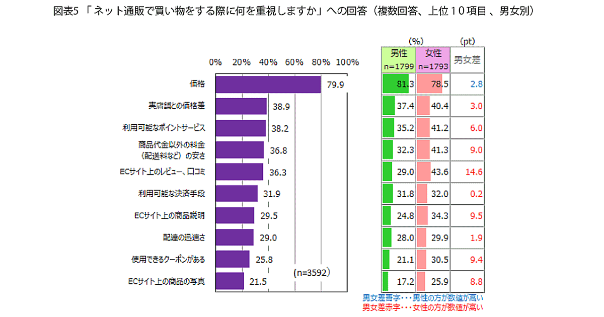 「価格」が79.9%で圧倒的トップ。「実店舗との価格差」が38.9%、「利用可能なポイントサービス」が38.2%、「商品代金以外の料金(送料など)の安さ」が36.8%と続いた。
