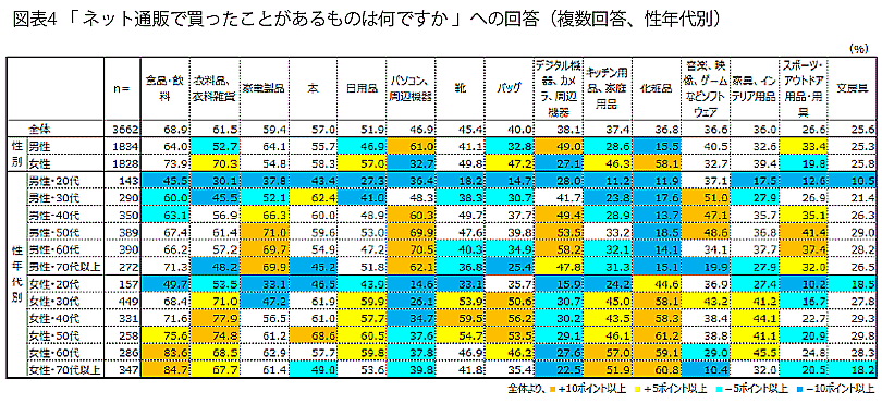 「食品・飲料」「キッチン用品、家庭用品」は高齢女性、「スポーツ・アウトドア用品・用具」「音楽、映像、ゲームなどソフトウエア」は壮年男性で高い数値となっている。