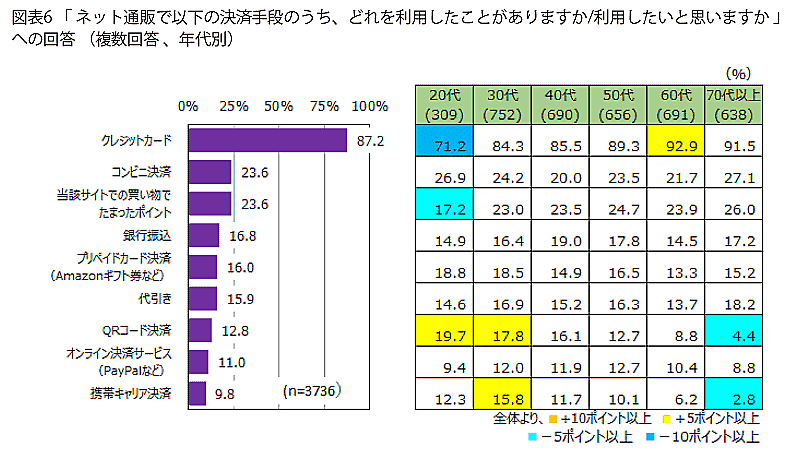 最も高かったのは「クレジットカード」で87.2%。2番目に多かったのが「コンビニ決済」で23.6%、同率2位で「当該サイトでの買い物でたまったポイント」。