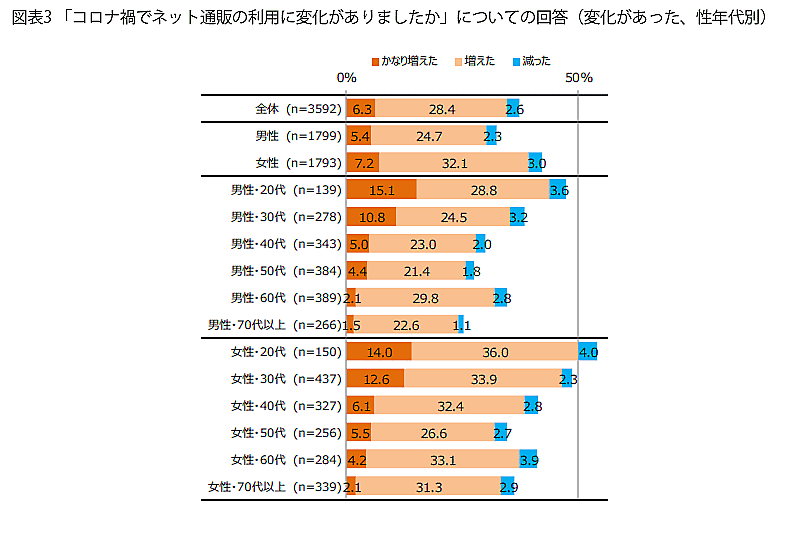 年代が上がるほど「かなり増えた」「増えた」の比率は低下するものの、男女とも60代で再び向上している。新型コロナの重症化リスクが高いとされた高齢層では、“外出を控えてネット通販で買い物をしよう”という意識が働いたと見られる。
