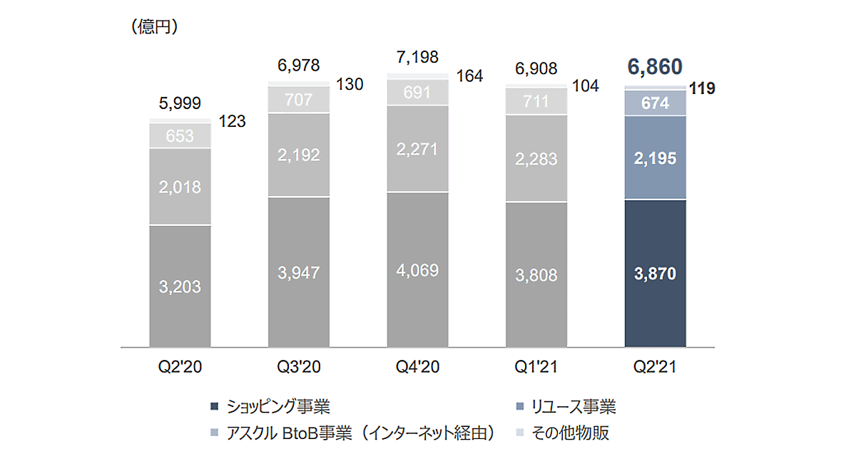 ショッピング事業の取扱高は、2021年4-6月期(第1四半期)が同0.4%増の3808億円、2021年7-9月期(第2四半期)は同20.8%増の3870億円。