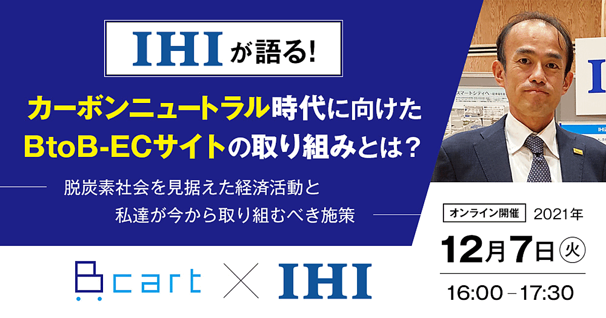 BtoBの受発注業務をEC化するクラウドサービス「Bカート」は12月7日、「IHIが語る!カーボンニュートラル時代に向けたBtoB-ECサイトの取り組みとは?~脱炭素社会を見据えた経済効果と、私達が今から取り組むべき施策~」と題したオンラインセミナーを開催する。