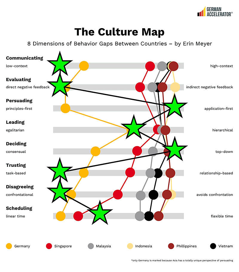 考え方の違いなどを学ぶための「ICHIGOのカルチャーマップ」を作成。世界中でベストセラーとなった『異文化理解力』の著者であるエリン・メイヤー氏が、マネージャーが自覚しておくべき8つの指標において67か国の文化の相対的位置づけを示した分布モデル「カルチャーマップ」を基に、ICHIGO用に仕上げた。