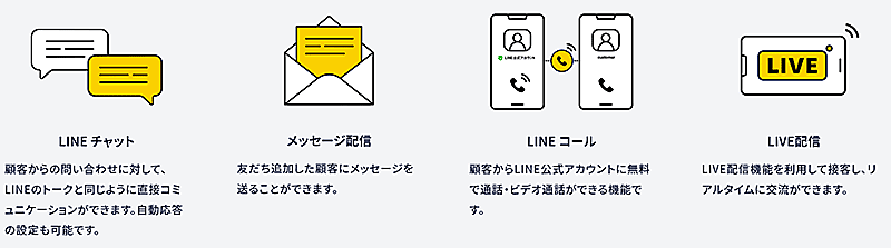 LINE公式アカウントには、1to1で会話ができる「LINEチャット」、友だち追加したユーザーに一斉にメッセージを送信できる「メッセージ配信」、特定のユーザーとビデオ通話ができる「LINEコール」、リアルタイムに複数に対して配信ができる「LIVE配信」など接客に使えるさまざまな機能があり、これらを活用したオンライン接客ができる。