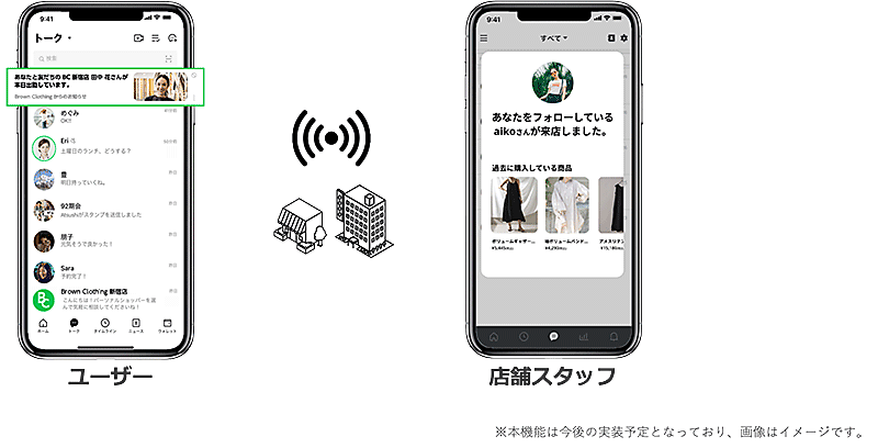 ユーザーが来店したタイミングに合わせて、買い物に役立つ情報を届けたり、LINE公式アカウントで店舗スタッフと友だちになっているユーザーが来店した際、店舗スタッフにプッシュ通知が来たりするような「来店検知機能」の実装を予定している。