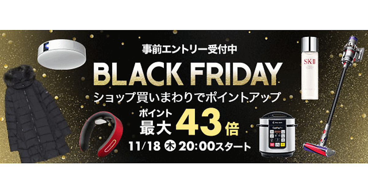 11月18日(木)から11月23日(火)まで、「楽天市場のブラックフライデー ポイント最大43倍!」を実施。買い物金額に応じたポイント付与率が最大で通常の43倍となる。