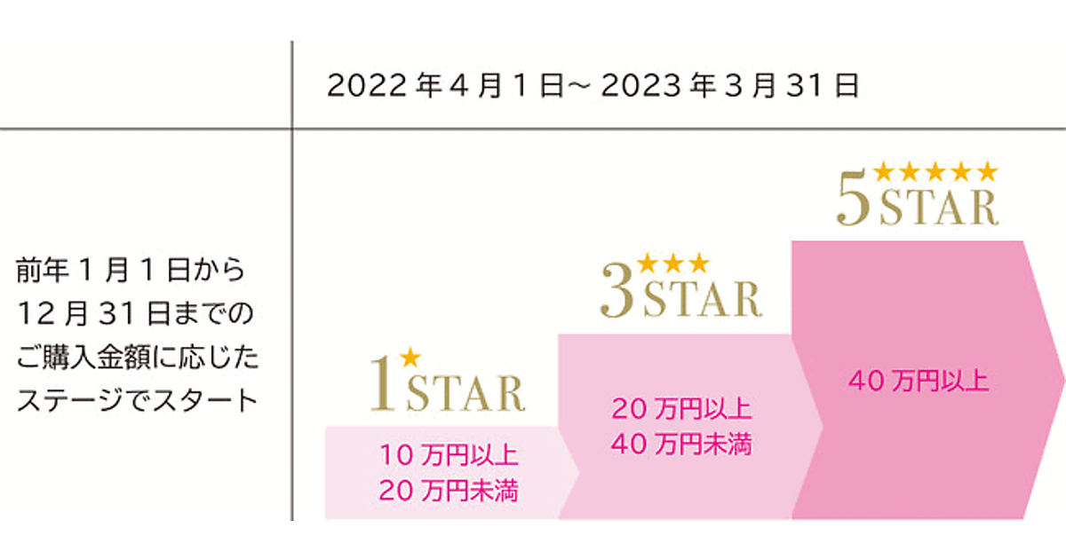 2022年以降、毎年4月1日に前年1月1日~12月31日までの購入金額に応じて、「1スター」「3スター」「5スター」の3ステージを適用する。