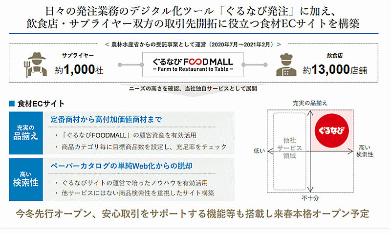 さらに、農林水産省からの受託事業として2020年7月から2021年2月まで、飲食店向け国産食材ECサイト「ぐるなびFOODMALL」を期間限定で運営。約1万3000店舗の飲食店と約1000社のサプライヤーネットワークを構築し、食材仕入れに関するニーズや課題の収集を行ってきた。