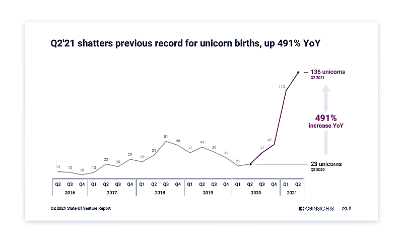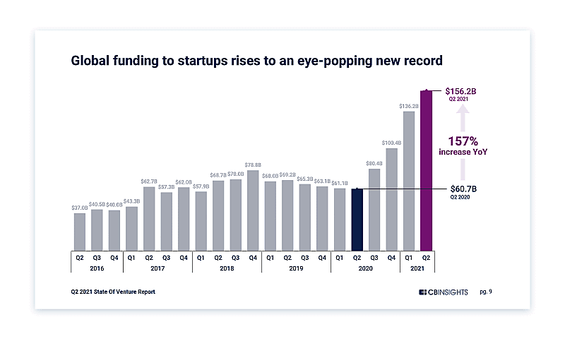 米調査会社CB Insights社の発表によると、2021年第2四半期のグローバル全体でのVC資金調達額は1562億ドル(約17兆円)で前年同期比157%増で、過去10年間で最高額を記録。