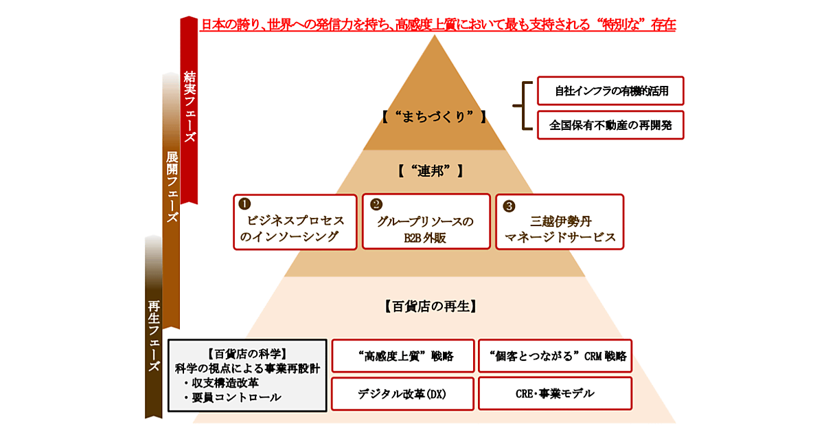 三越伊勢丹ホールディングスが策定した「2022~2024年度 中期経営計画」では、社会の変化を機会とリスクとして捉え、基本戦略を「高感度上質消費の拡大席巻 最高の顧客体験」とし、その実現に向けた重点戦略を「高感度上質戦略」「個客とつながるCRM戦略」「連邦戦略」とした。