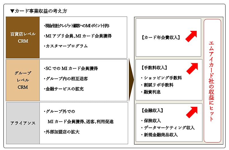 決済インフラ整備では、「多様な決済ニーズへの対応」「制度見直しによる効率化」を図りつつ、「決済における安全性向上」を促進。インバウンド戦略では、「新規顧客獲得」「買回りおよびリピート顧客売上」「海外富裕層顧客売上」を拡大する。「百貨店レベルによるCRM」「グループレベルによるCRM」「アライアンス」でカード事業の収益を向上させる。