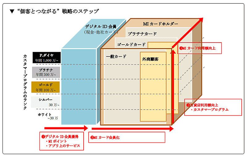百貨店レベルCRMでは、「識別顧客の裾野拡大」と「三越伊勢丹アプリを活用したパーソナルな施策」を促進する。グループレベルCRMでは、「百貨店外のカード獲得強化と相互送客」「百貨店・金融サービスの利用促進」「MIカードの魅力・利便性向上」を促進する。