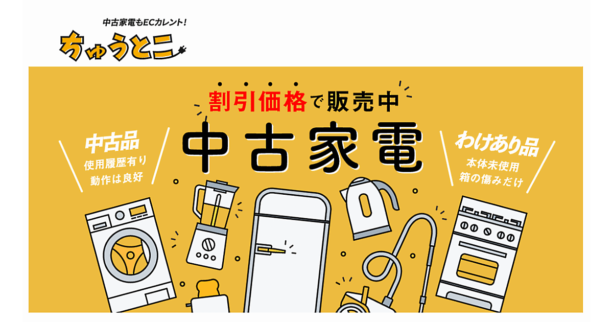 ECサイト「ECカレント」内に、中古家電販売サービス「ちゅうとこ」を開設。パソコン、レコーダー、空気清浄機、季節家電など動作良好の中古品、本体未使用で箱の傷みだけといったわけあり品などをそろえ、1か月の保証付きで販売する。