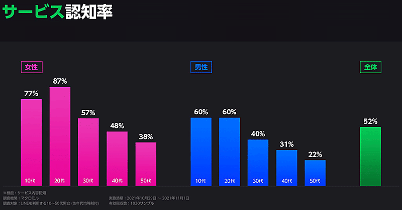 サービス認知率は全体で52%、最多は20代女性の87%
