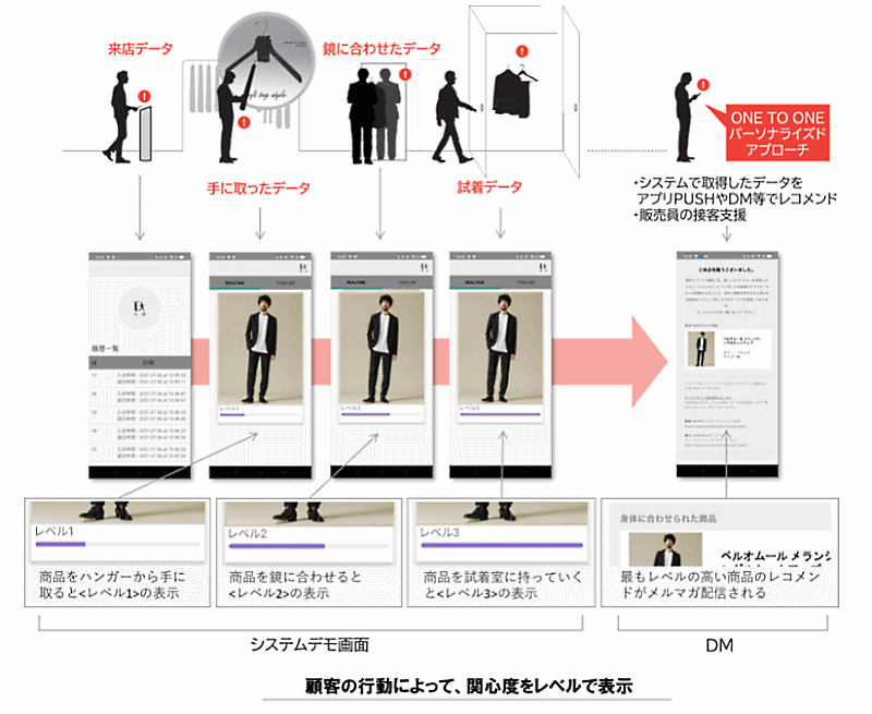 消費者が入店時にナノ・ユニバースのアプリを起動しチェックイン、商品を手に取るとハンガーに装着したセンシングデバイス、「姿見」「試着室」に設置したビーコンから位置情報や商品情報などをアプリに送信。それらの情報と店舗内のカメラで検知した行動変化情報などを、顧客IDと共にクラウド上の行動分析システムに送信し、分析する。顧客の行動情報や商品に対する興味度の把握が可能となる。