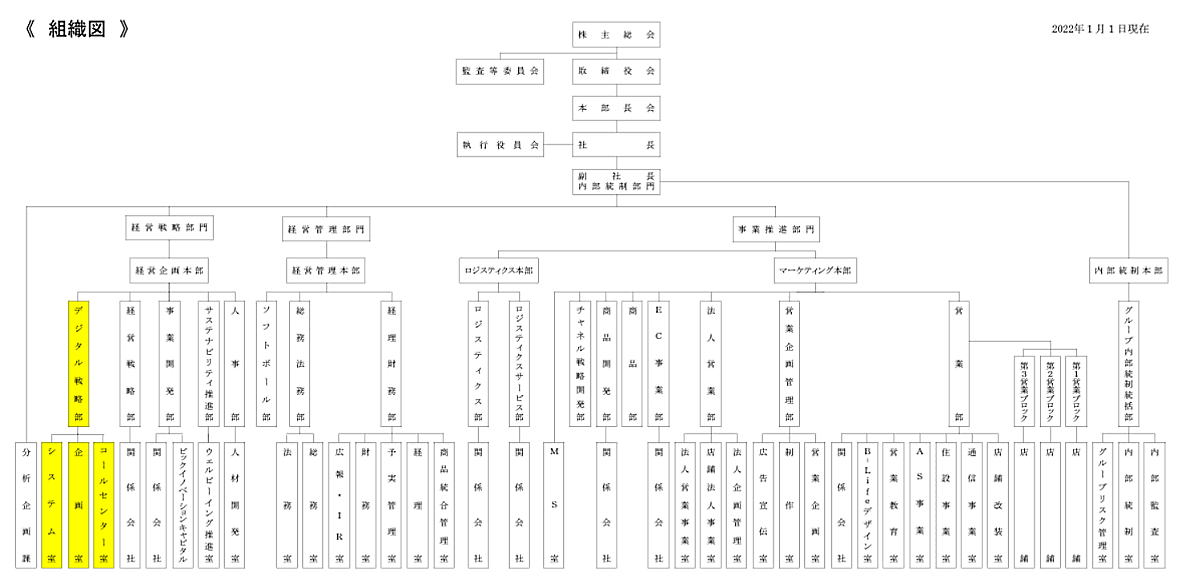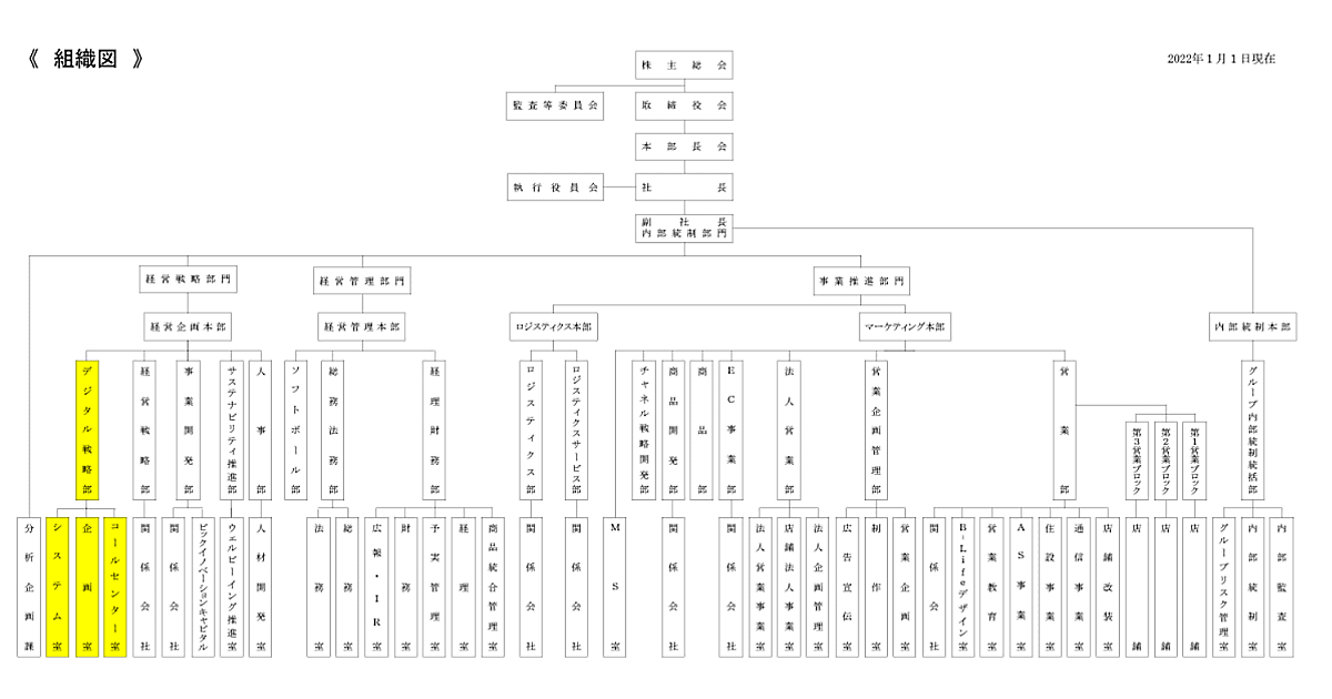 ビックカメラは2022年1月1日付で、システム部を改組し、経営戦略部門経営企画本部直下に「デジタル戦略部」を新設した。その配下に、「システム室」「企画室」「コールセンター室」を置いた。