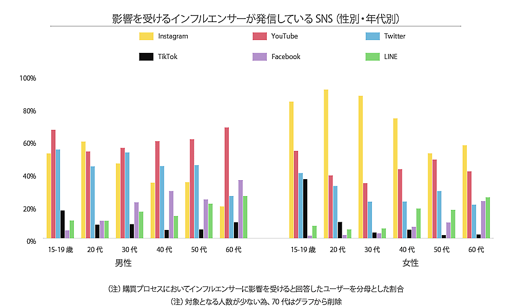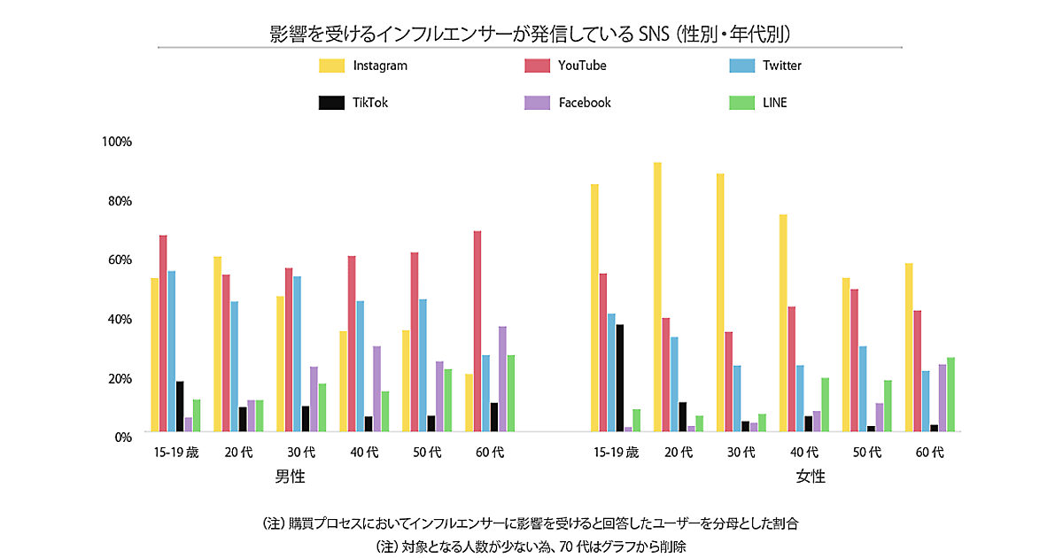 インフルエンサーが発信している内容に影響を受けるSNSの内訳を見ると、女性ではすべての年代でInstagramが最も高く、特に若年層でその傾向が顕著だ。男性は女性よりもYouTubeからの情報取得の割合が全年代で高い。女性の15-19歳ではTikTokからの情報取得の割合も高くなっている。
