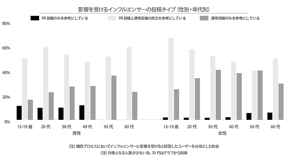 インフルエンサーが発信する内容のうち、通常投稿とPR投稿から影響を受ける度合いに関しては、すべての年代で「PR投稿と通常投稿の両方から影響を受ける」が最も高くなっている。女性は年齢が上がるにつれて通常投稿のみから影響を受ける割合が上昇している。