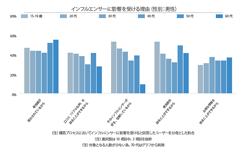 また、15-19歳、20代では「そのインフルエンサーが好き、信頼しているから」といった理由の割合も高く、投稿内容にかかわらずインフルエンサーへの信頼度、共感度の高さから情報を得ていると考えられる。