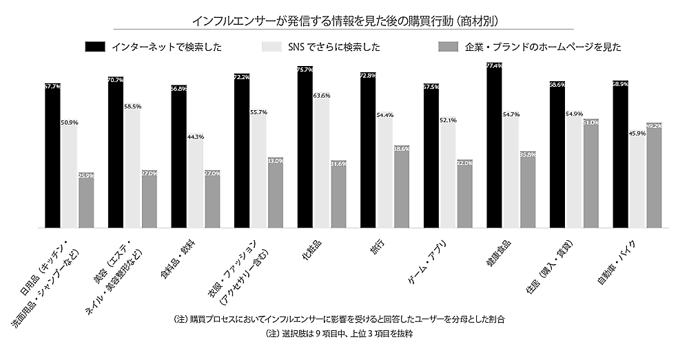 商材別では自動車・バイク、住居などの耐久消費財では企業・ブランドのホームページを見る割合も高く、金額が高く検討期間が長い商品ほど参照する情報源の数が多い傾向にある。使用感や使用方法が重視される傾向にある化粧品では、SNSでさらに比較する割合が他商材と比較して高くなっている。