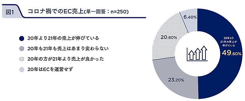 コロナ禍でのEC売上について2021年と2020年の比較で聞いたところ、「2020年より2021年の売上が伸びている」(49.6%)、「2020年も2021年も売上はあまり変わらない」(23.2%)「2020年の方が2021年より売上が良かった」(20.8%)「2020年はECを運営せず」(6.4%)の順になった。ほぼ半数の事業者が、2021年は2020年よりEC売上が伸びている。