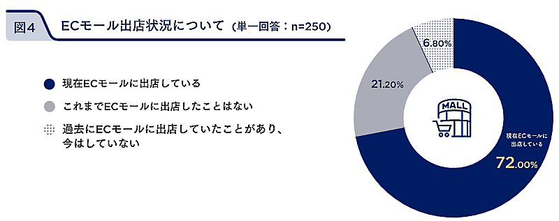 ECモールへの出店状況について、「現在ECモールに出店している」事業者が約7割。「これまでECモールに出店したことはない」は約2割だった。「過去にECモールに出店していたことがあり、今はしていない」は6.8%。