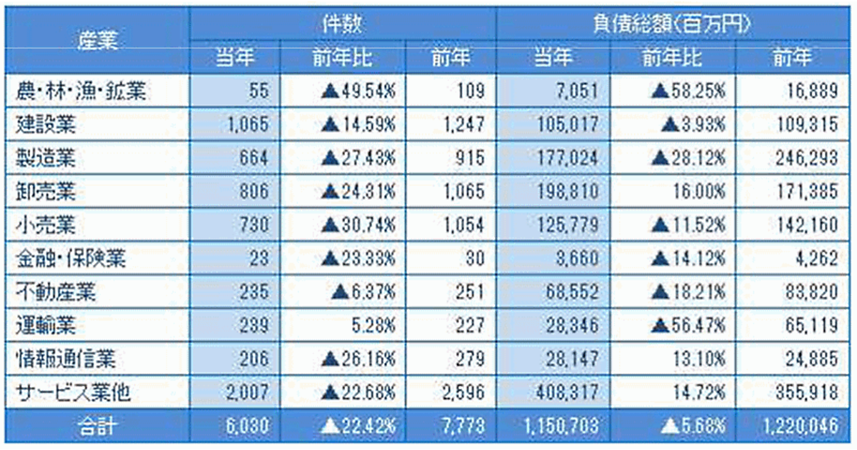 倒産件数は1990年(6468件)以来の6000件台で、2年連続で前年を下回った。コロナ禍の各種支援策が奏功し、1964年(4212件)に次ぐ57年ぶりの低水準。