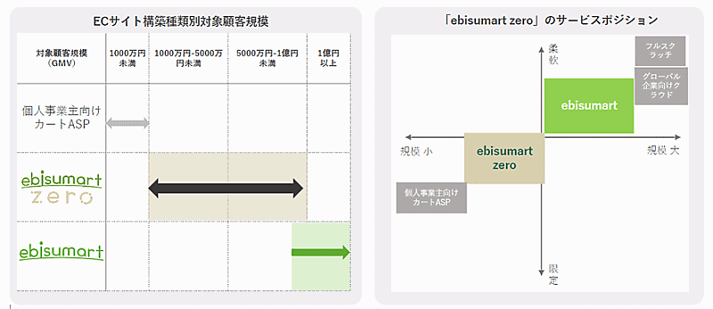「ebisumart zero」は中小規模EC事業者向けだが、無料のショッピングカートASP、その上のレイヤーであるカートASPやECプラットフォームとターゲットを異にする。