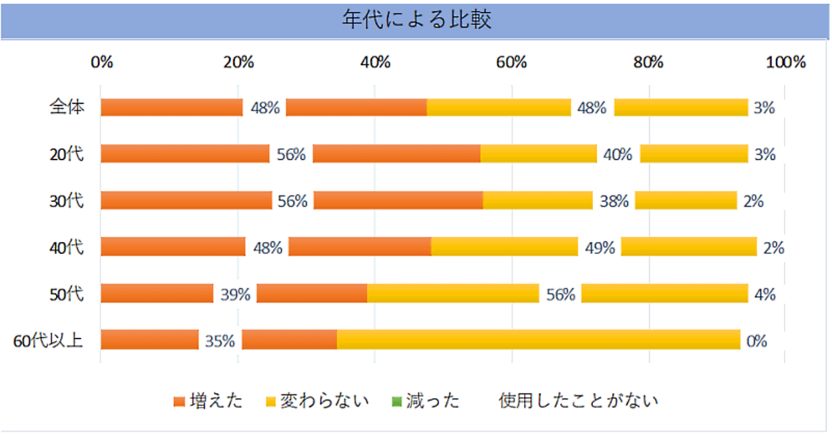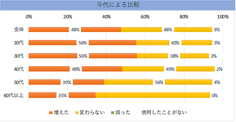 コロナ禍でネットショッピングの利用が増えたか聞いたところ、全体では「増えた」が48%、「変わらない」が48%。年代別では20代と30代の48%が「増えた」とそれぞれ回答した。