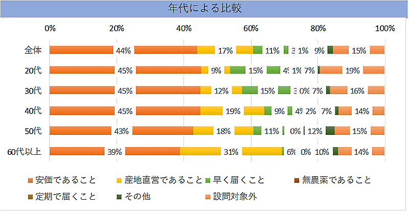 食品をネットで購入する上で最も重視するポイントは、「安価であること」が最も多く44%。「産地直営であること」が17%、「早く届くこと」が11%。「安価であること」は各年代で最も重要視する理由となっている。