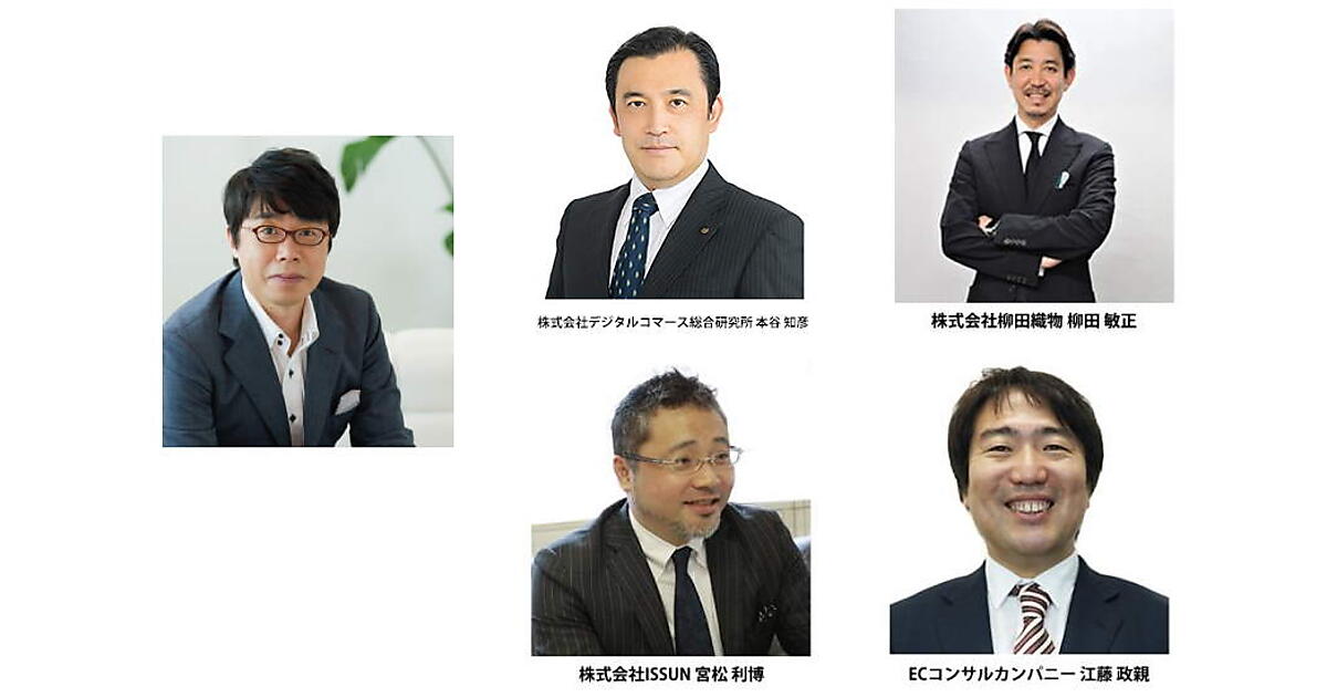 JECCICA代表理事の川連一豊氏、デジタルコマース総合研究所の本谷知彦氏、柳田織物の柳田敏正社長、ISSUNの宮松利博社長、ECコンサルカンパニーの江藤政親社長が登壇。