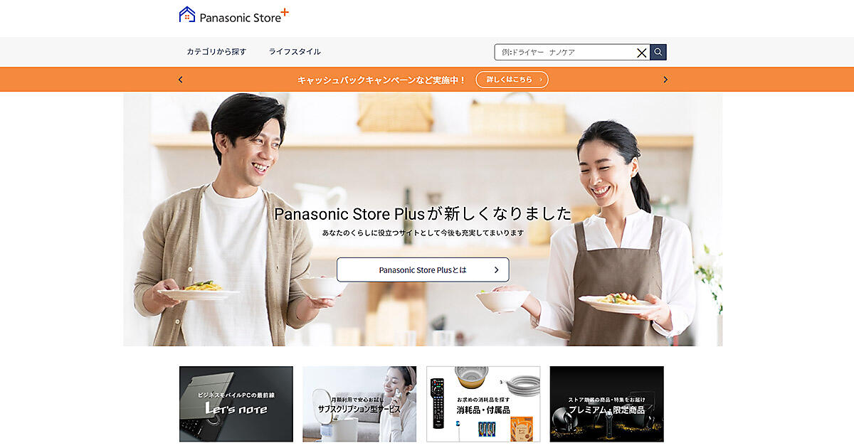 「Panasonic Store Plus」はパナソニックの家電製品の販売、サブスクリプション型の定額利用サービス、商品や暮らしに役立つコンテンツの発信、キャンペーンの実施などを展開している。