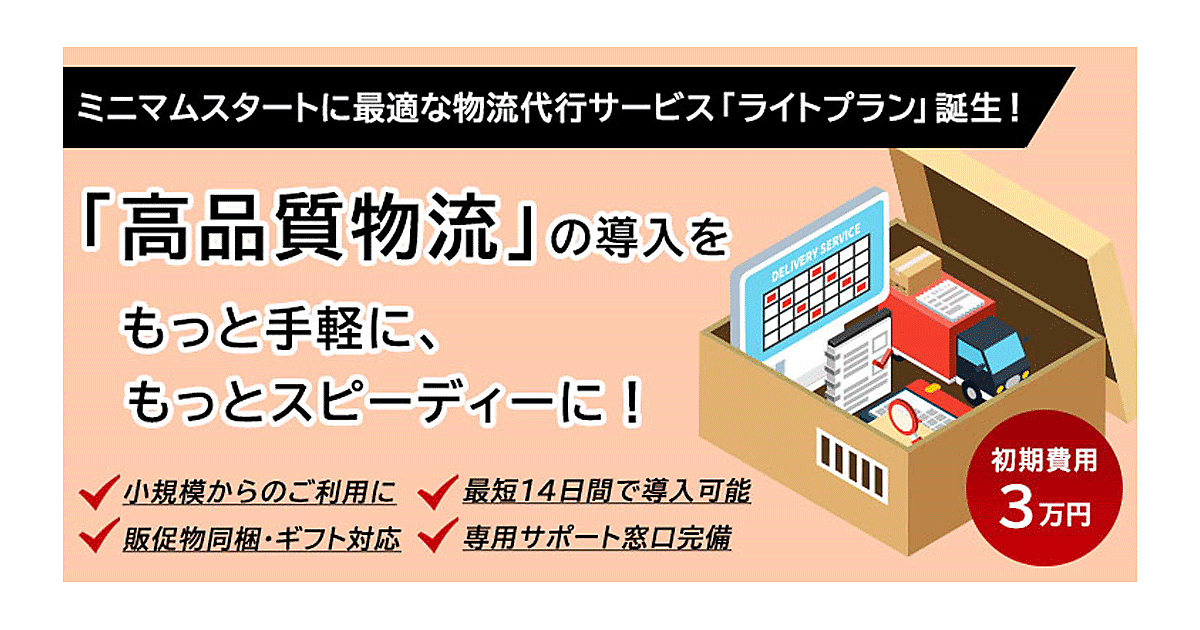「ライトプラン」は少ない出荷件数から対応可能の物流代行サービス。一般的な中小規模事業者向けの物流代行サービスでは難しいとされる「販促物同梱」「ギフトラッピング」も標準対応している。