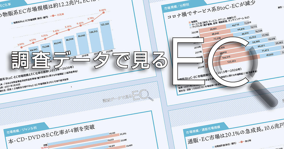 経済産業省の「令和2年度産業経済研究委託事業(電子商取引に関する市場調査)」をはじめ、各省庁や日本通信販売協会、調査会社各社が発表したデータを、同じフォーマットで見やすくまとめました。ECを取り巻く環境を知るための資料として、企画書やプレゼンにご利用ください(第三者への配布や商用利用はご遠慮ください)。