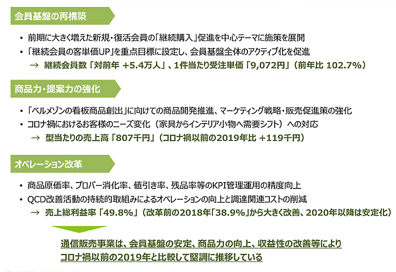 「商品力・提案力の強化」では、「ベルメゾンの看板商品創出」に向けての商品開発を推進、マーケティング戦略・販売促進策を強化した。コロナ禍における顧客ニーズ変化(家具からインテリア小物へ需要シフト)に対応することで、型当たりの売上高80万7000円となり、コロナ禍以前の2019年比で11万9000円増加した。